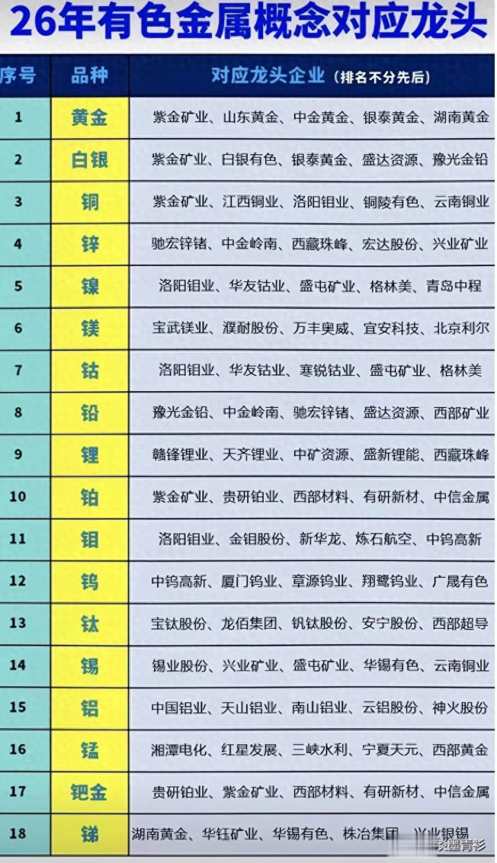 2026年一开年,有色金属板块又成了资金的香饽饽。但很多人买有色,只看名字不看逻辑,结果追高套牢。今天咱们就把话说明白:有色不是随便买的,每个品种的“命门”不一样,龙头的价值也天差地别。咱们不搞虚的,直接深扒每个细分赛道的核心逻辑,告诉你哪些龙头才是真金不怕火炼。